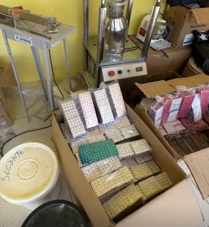 Durante as buscas, os agentes localizaram cerca de 300 mil comprimidos de anfetaminas prontos para comercialização. Também foram encontrados insumos químicos, embalagens, maquinários específicos e cadernos de anotações relacionados à fabricação e distribuição da droga. Uma receita apreendida no local reforça a suspeita de que a propriedade funcionava como um centro de produção de entorpecentes.