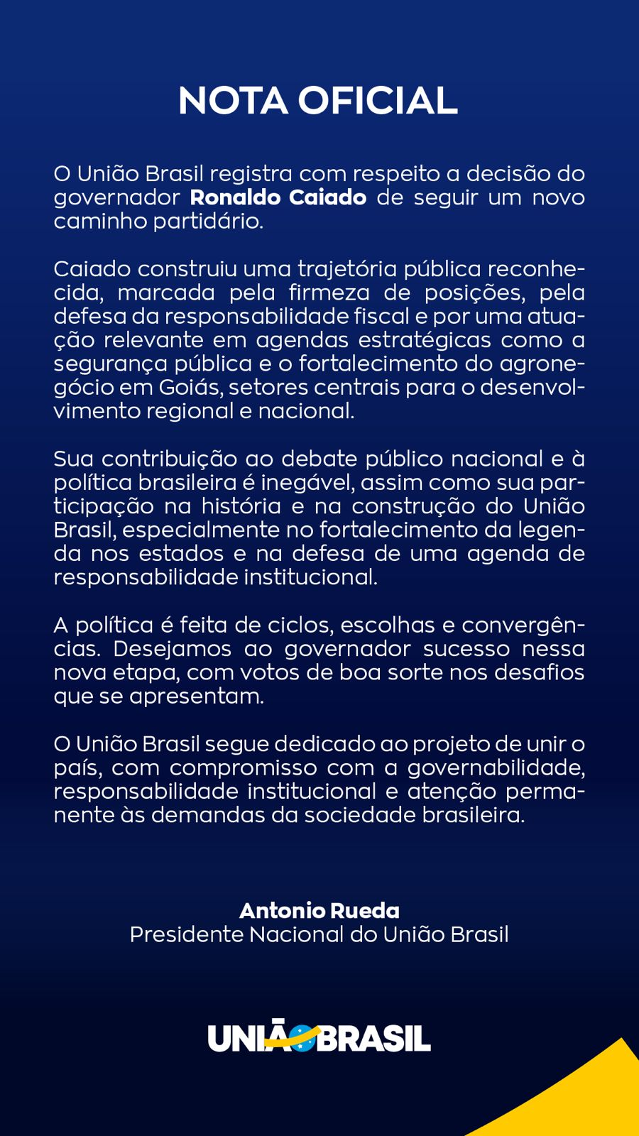 Em sua declaração, Rueda afirmou compreender a decisão do governador e ressaltou que o União Brasil reconhece a trajetória construída por Caiado dentro da sigla. O dirigente destacou o perfil firme do goiano e sua atuação em pautas consideradas centrais durante sua passagem pelo partido.